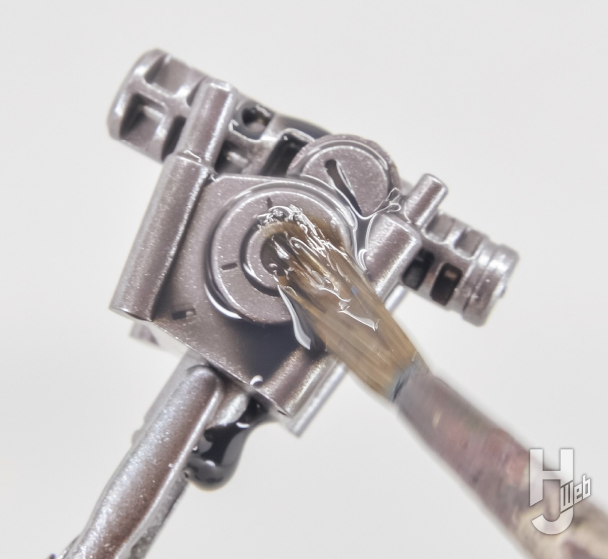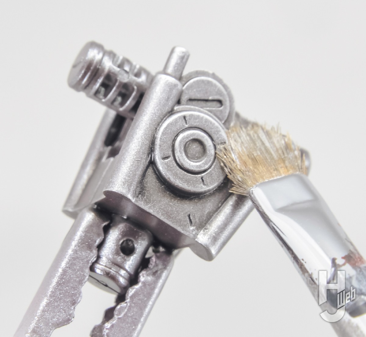 ▲ウォッシングが終わったら、ファレホのシルバーでドライブラシを施します。関節部は凹凸が多いためディテールが浮き上がり、エッジ部が金属的に輝くため、金属感をより強調することができるのです
