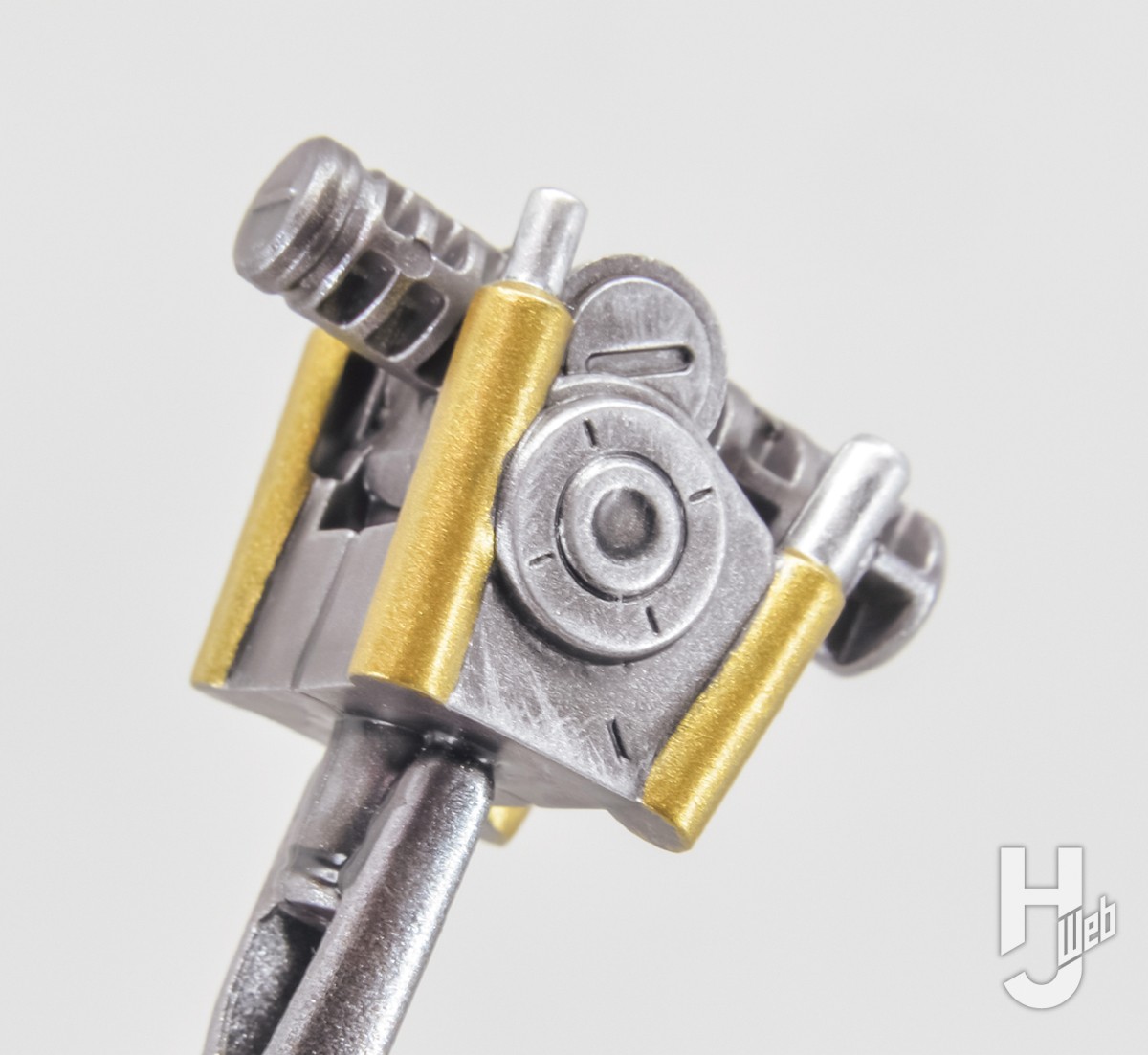 ▲劇中ではヘビィマシンガンの直撃をくらってもほぼ無傷に見えるブラッドサッカーですが、激しい移動などでターンピックは相当に摩耗するはず……というわけでシルバーでハゲチョロ塗装。ドライブラシのようなランダムな傷ではなく、筆でひとつひとつ傷を描き込み、本体の仕上げに合わせた清潔感のある絵画的な表現としました