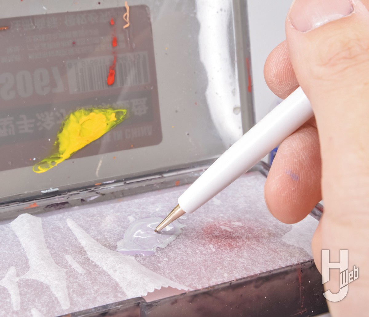 ▲ホルベインのペンチングソルベントをウェットパレットに出し、面相筆の先端に染み込ませます。これは水性絵の具用のうすめ液で、水よりも塗料が乾燥しにくく、塗った時の伸びもよくなるため、筆塗り作業を楽にしてくれます