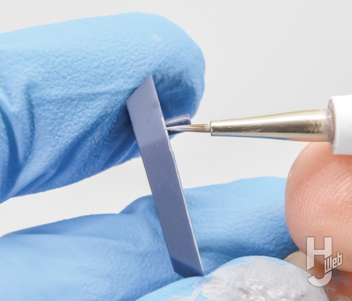 ▲それでは塗っていきましょう。最初から筆を上手く使うのは難しいので、まずはもっとも簡単な鋭角のエッジ部分から塗っていきます。方法は簡単で、このように筆先のやや側面を使ってエッジをなぞるだけです