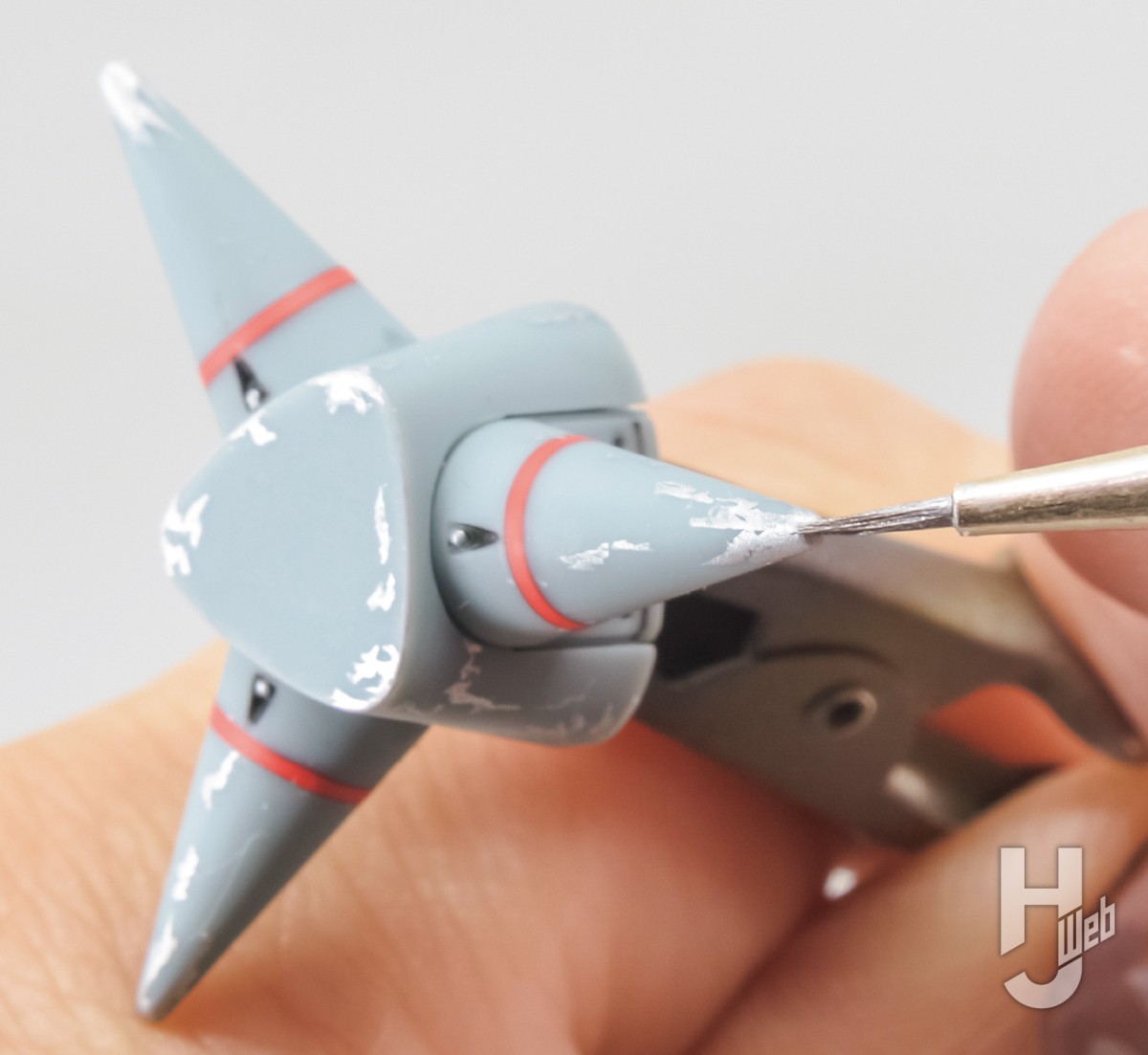 ▲キットの外装には繊細なリベットのディテールが施されています。これを強調するため、シルバーで塗り分けます。下地が黒く、メタリック系塗料の反射率が高いので、筆の先端でほんのわずかに色を乗せるだけでバッチリ発色します