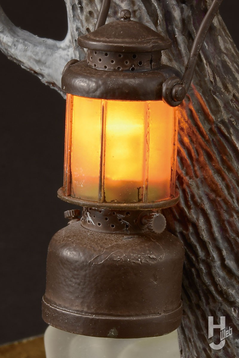 付属のランタンはベースの脇に置く設定のようですが、キットに盛り込みたくて樹木のちょうどいい部分の枝の位置を少しズラして接着。そこにランタンを掛けることにしました。ランタンのガラス部分は透明プラ素材なのでキチンと塗り分け、100円ショップで購入したキャンドルライトを分解して内側に仕込みました。