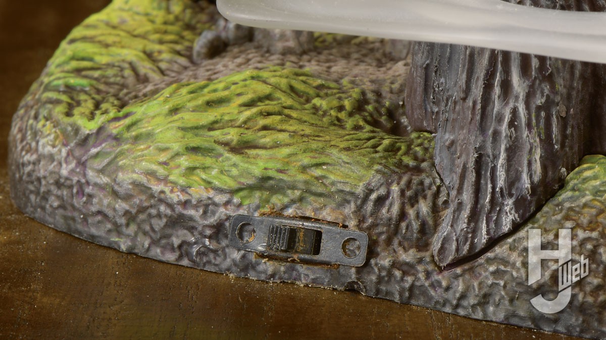 ▲ランタンは木の枝にぶら下げ、内部に100円ショップで購入したキャンドルライトを分解して仕込み電飾。配線は木の中を通し、スイッチはベース脇に設置した