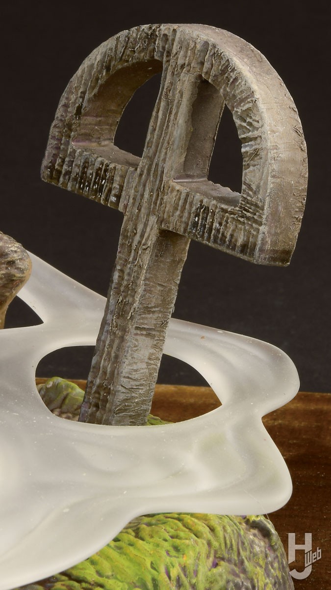 さて、キットはいつもながらの造形の良さに加えて、足元に漂う霧のエフェクトを透明プラ素材で表現しているのが面白いところ。これまでのモンスターたちと違って表現すべき複雑な体表ディテールはありませんから、ごく普通の貼り合わせ式の構成のキットで、洋服部分は縫い目に沿っての分割でほぼ合わせ目消しは必要はなく、フェイスと手足のパーティングラインと合わせ目消しに注力できます。私はランナーを細かく切ってジクロロメタン(アクリル素材に使われる揮発性の高い接着剤)に漬けて作った速乾性の自作パテを使用。乾燥したのを確かめたら、まず表面のウネリをヤスリでならしてから体毛のモールドを彫刻刀やナイフ、ニードルを使ってキットのモールドに沿って入れていきます。この時、成型の都合でパーツの端のモールドが浅くなっている部分も深く修正します。仕上げに流し込み系接着剤を全体に塗布してならしました。