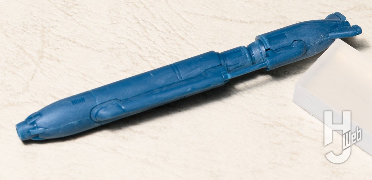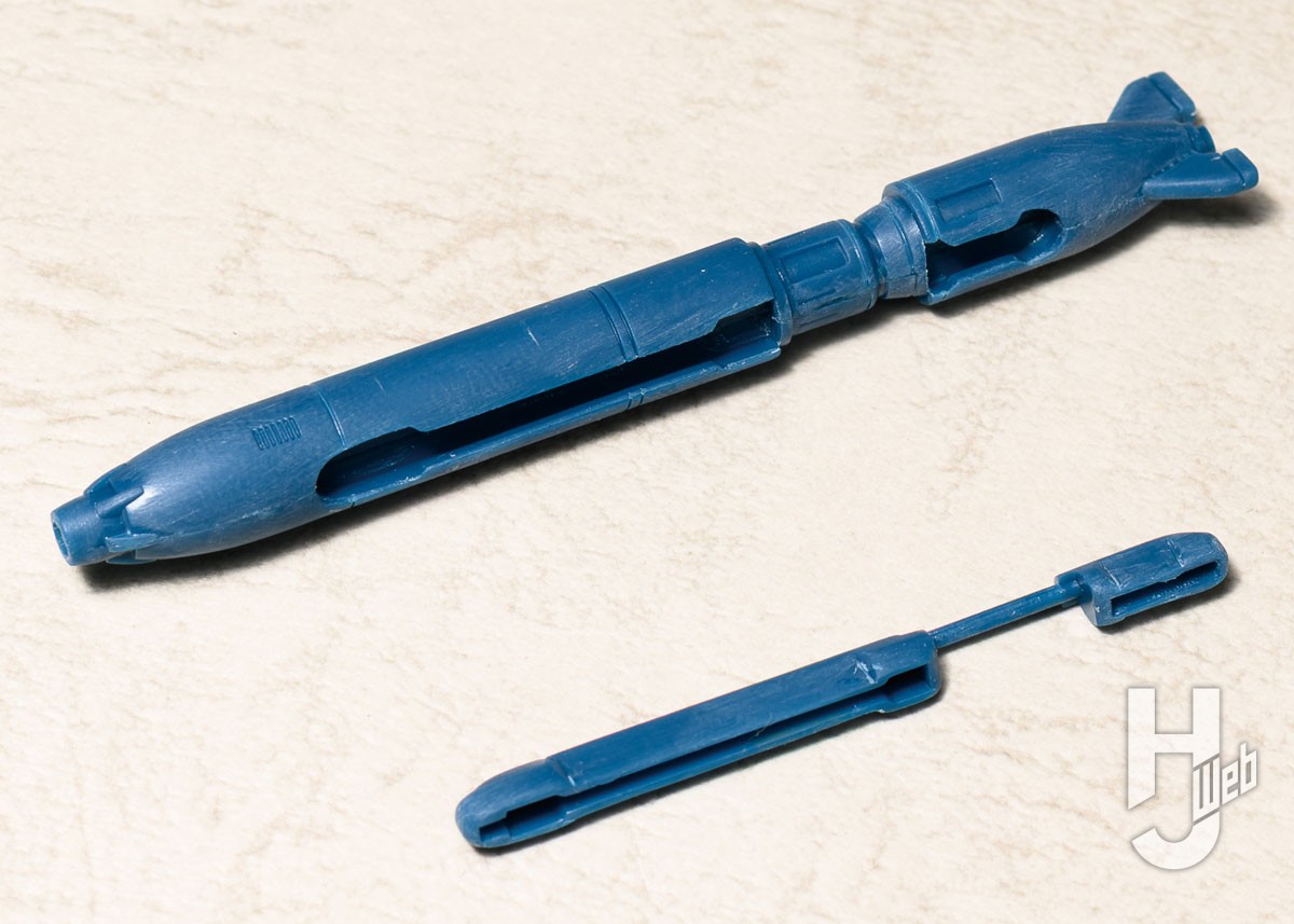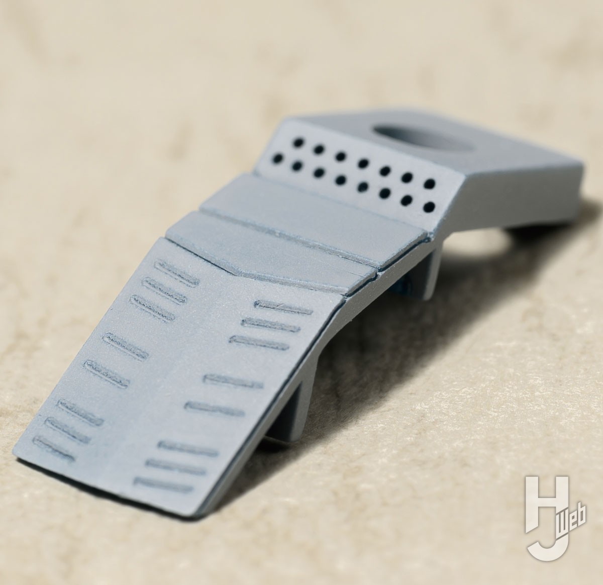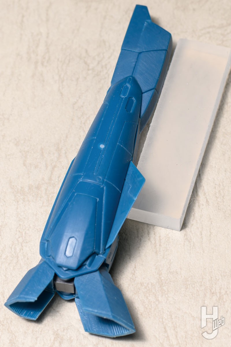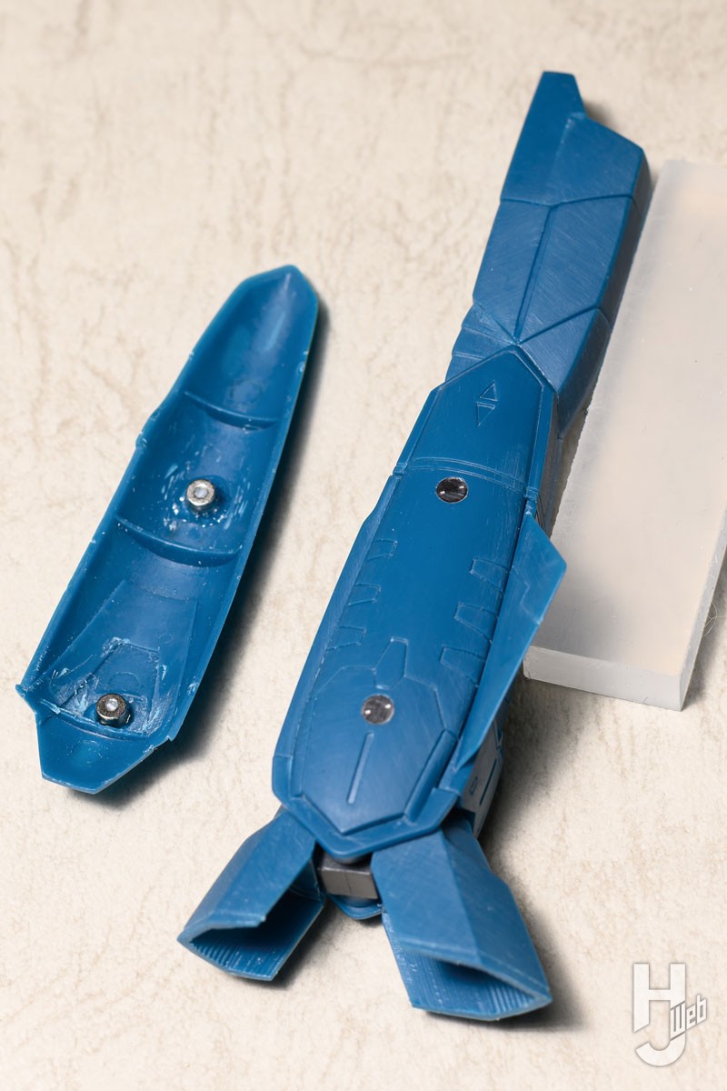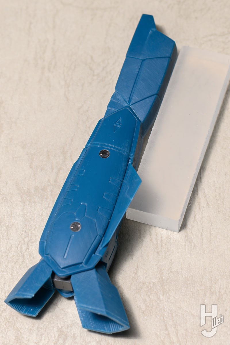 胸部裏側に大きな肉抜きがあるので、プラ棒で自作したもので埋めました。脇腹のシャッターは段落ち加工しています。胸部の丸穴はセンターガイド付きスピンモールド等で彫り直しています。少し寂しく感じた箇所はスジ彫りを追加し、各翼パーツはモールドの彫り直しと翼端を薄々化しました。