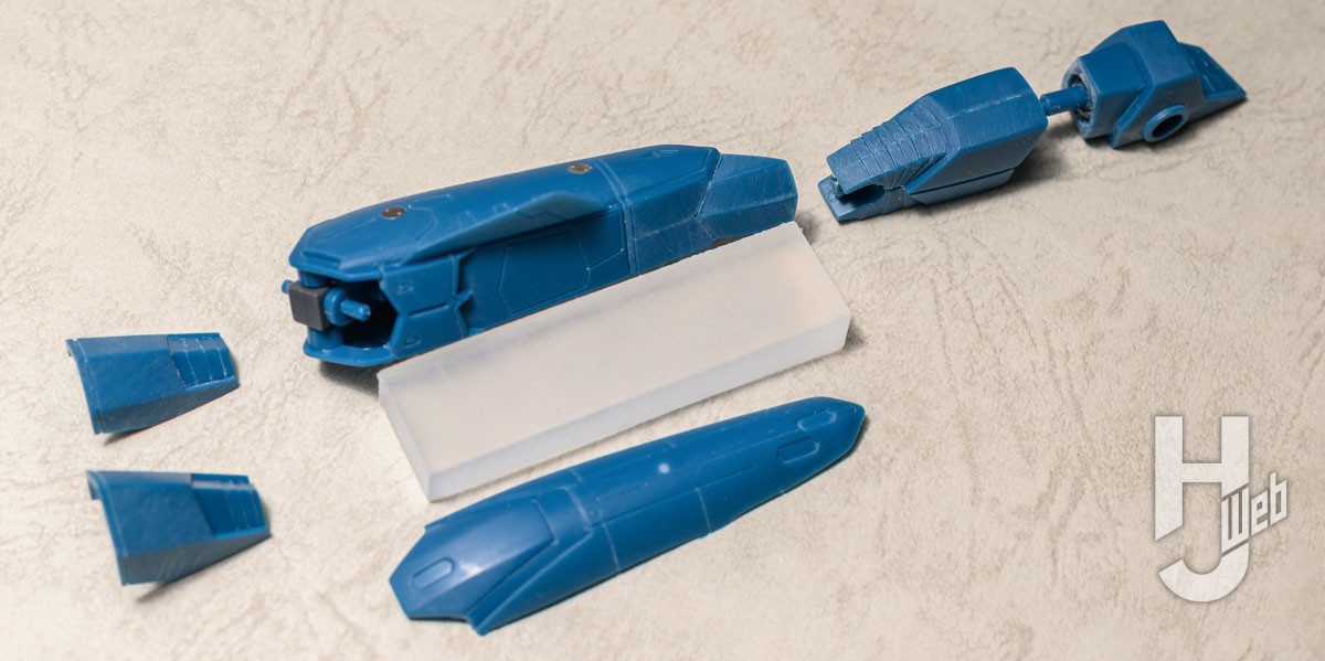 ▲ガンポッドは上部パーツがはさみ込みになっているので、合わせ目処理のために一部を削って後ハメ化した