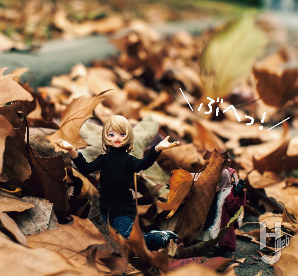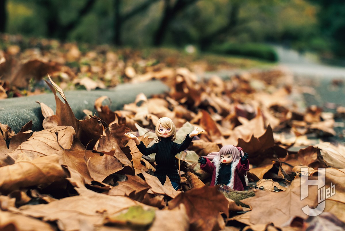 画面の主役は彼女ですが、脇役である落ち葉の配置も欠かせません。あえてカメラのすぐ前に大きな葉を置くことで、写真に奥行きが生まれ、見ている人が彼女たちのすぐそばまで近づいたような臨場感を演出しました。