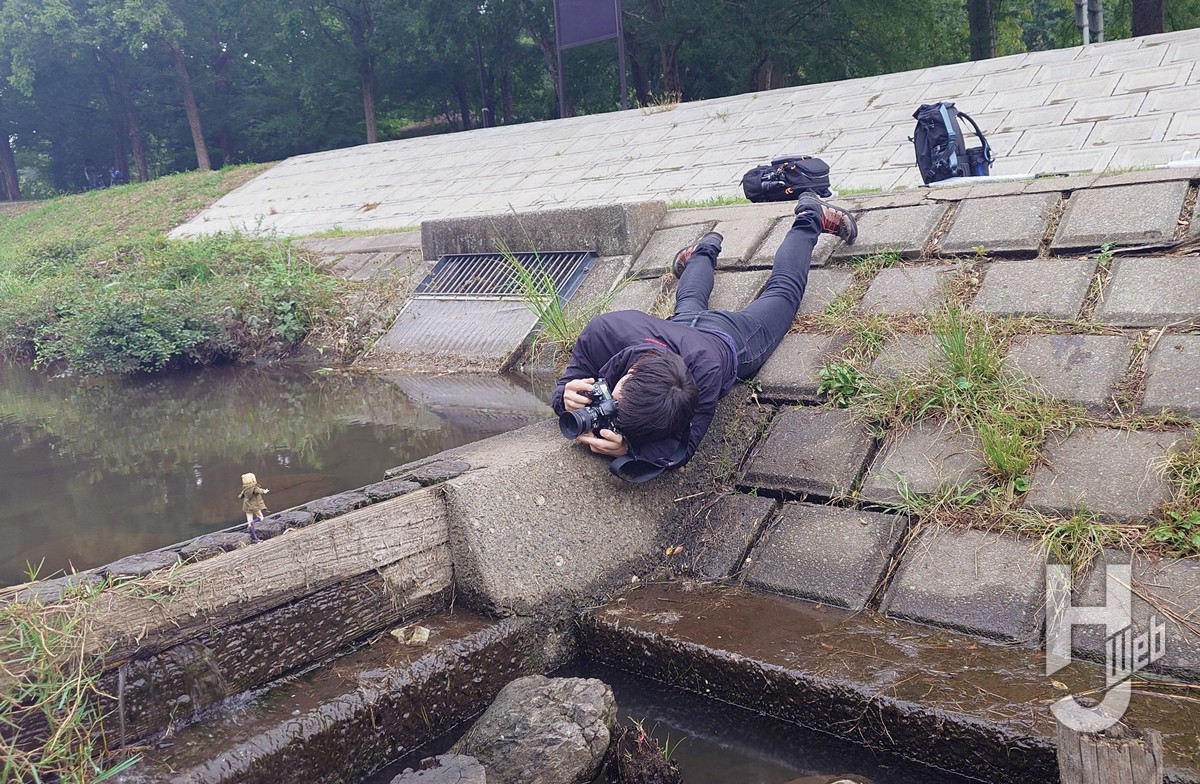 周囲の視線も気にせず撮影に挑むこの姿がSNSで大バズり! 一見驚くような体勢ですが、すべては一枚に懸ける熱意と愛情ゆえ。その本気が、高クオリティな作品を生み出しています。