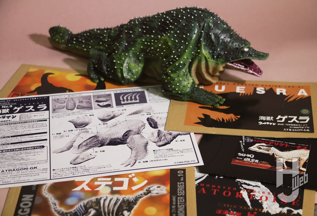 さて、昨年から折を見て書き進めている原型師さん の記事ですが、今回は海獣ゲスラとともにアトラゴンGKの宮崎逸志氏のことを綴っていこうと思います。思い返せば宮崎さんが颯爽とガレージキットシーンに登場したのは2005年のことでした。繰り出したのはガマクジラとゲスラの2体。背中のイボと無数の棘、どちらも成型に難のある怪獣のため、ほとんどのメーカーが30cmサイズで出すことを躊躇しておりました。(ならば僕の出番やな)そう言われたかどうかは定かではありませんが、ノリの良い宮崎さんのキャラならばあり得る話です。先ずは資料本を掻き集め、本映像はキャプチャーして徹底的にリサーチを行います。全身のバランスは当然のこと、腕や脚を曲げた際の皺の寄り方、一瞬だけ映る口の中、転んだ時の尻尾の付け根など、それはもう呆れるくらいです。食事をともにしながら(この部分がどう)とか(ここからあそこにかけてがこんなん)とか、怪獣好きの僕でもドン引きするほどの熱量で考証されておりました。さらにはガマクジラのイボはインセクトピンで再現、ゲスラの棘はホワイトメタルで成型したものを400本揃えるという凝りようです。傍から見ていてもちょっとやり過ぎなんじゃないかと思うくらいでした。