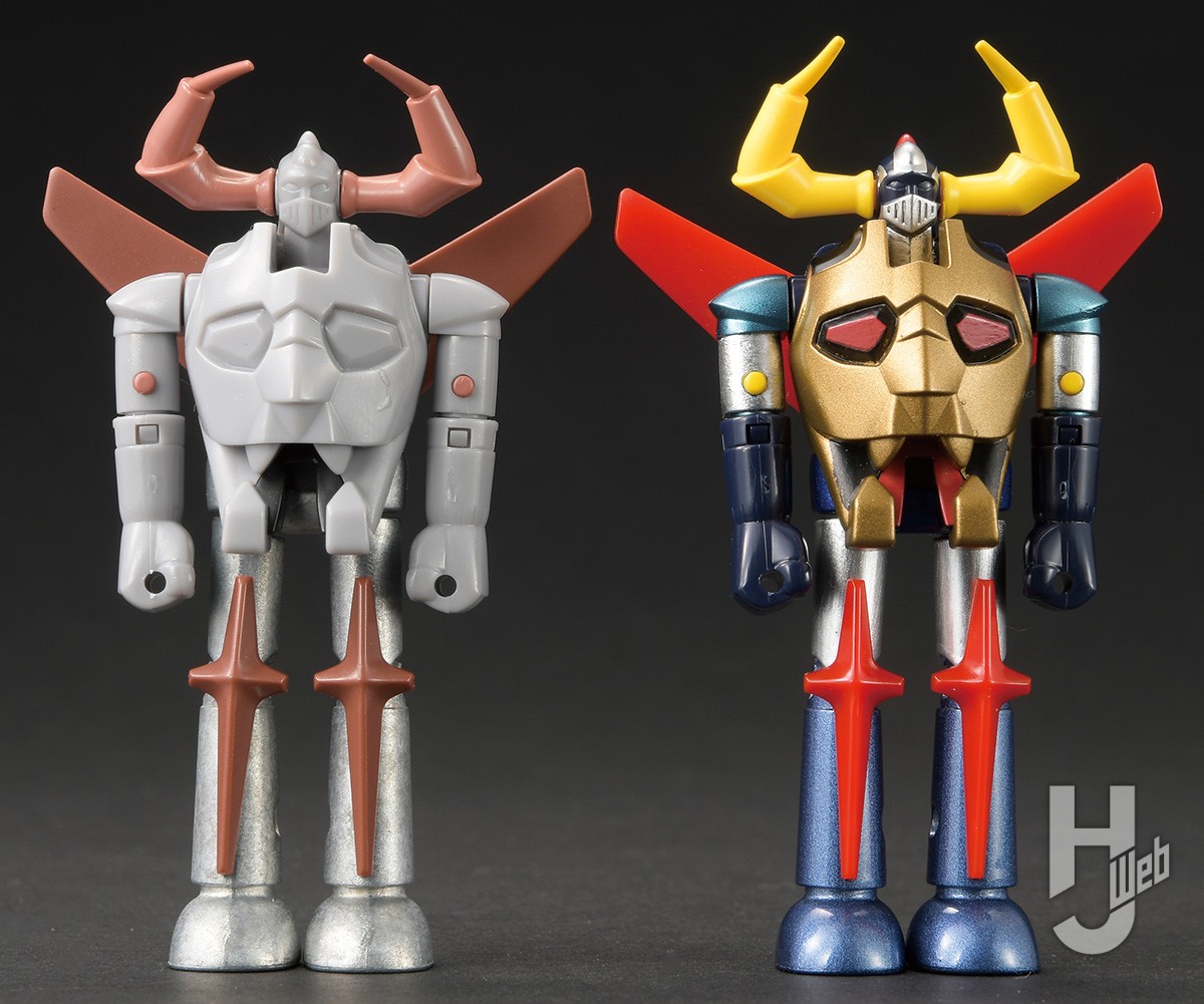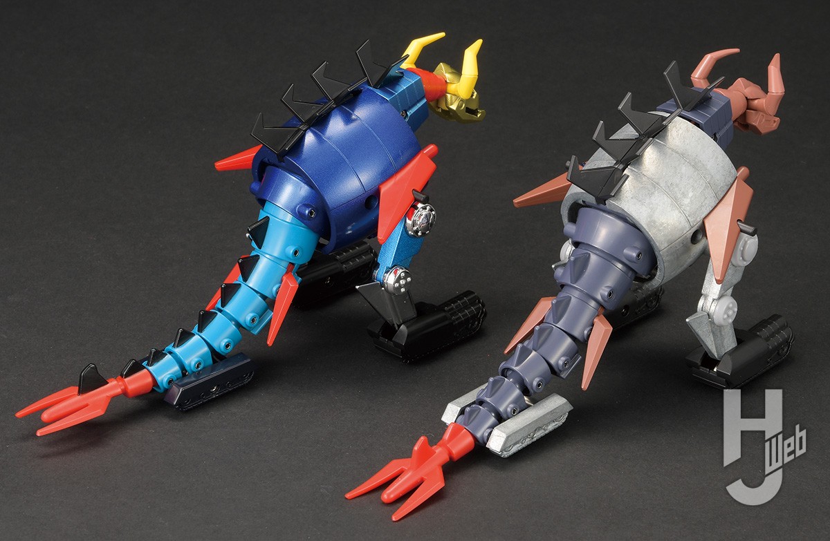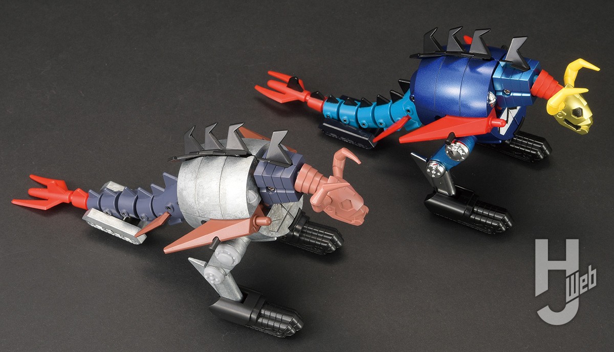 未塗装のテストショットが届いた。大空魔竜は、胴体と脚部、尻尾の履帯部分にダイキャストを使用。ガイキングは背中とカウンタークロス以外の下半身がまるまるダイキャスト製。どちらも超合金ならではの重量感と触り心地になっている。