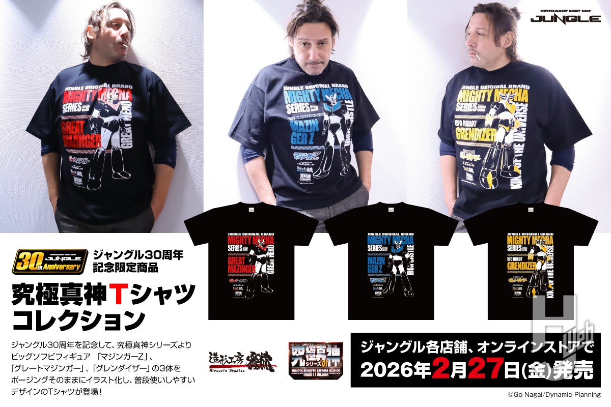 ジャングル30周年記念限定商品として究極真神Tシャツコレクションが発売決定! 2026.01.30 造形工房密林その他 ※アニメグッズ等 ジャングル30周年を記念して、究極真神シリーズより ビッグソフビフィギュア 「マジンガーZ」、「グレートマジンガー」、「グレンダイザー」の3体を ポージングそのままにイラスト化し、普段使いしやすいデザインのTシャツが登場! 詳しくはコチラ↓ https://jungle-scs.co.jp/?p=8019 製品情報 商品名 究極真神Tシャツコレクション グレートマジンガー 製品画像 発売日 2026/02/27 税込価格 5500円 備考 サイズ:Lサイズ・XLサイズ 商品名 究極真神Tシャツコレクション マジンガーZ 製品画像 発売日 2026/02/27 税込価格 5500円 備考 サイズ:Lサイズ・XLサイズ 商品名 究極真神Tシャツコレクション グレンダイザー 製品画像 発売日 2026/02/27 税込価格 5500円 備考 サイズ:Lサイズ・XLサイズ この製品が気に入ったらシェアしてください! 前の製品 究極真神シリーズ ビッグサイズソフビがジャングル30周年記念... 次の製品 ---