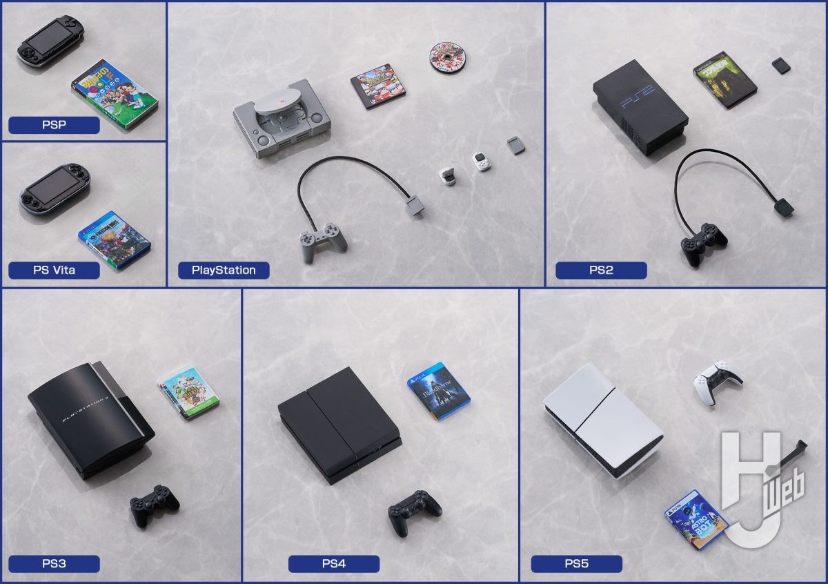 「PlayStation™」、「PlayStation™2」、「PlayStation™Portable」、「PlayStation™3」、「PlayStation™Vita」、「PlayStation™4」、「PlayStation™5」、「メモリーカード(PS1)」、「メモリーカード(PS2)」、「PocketStation」、「PocketStation(開き状態)」、各コントローラー 1点、専用手首 3種、各ソフト 1点、(「サルゲッチュ」、「ワンダと巨像」、「みんなのGOLF」、「FREEDOM WARS」、「トロともりもり」、「Bloodborne」、「アストロボット」)シールシート