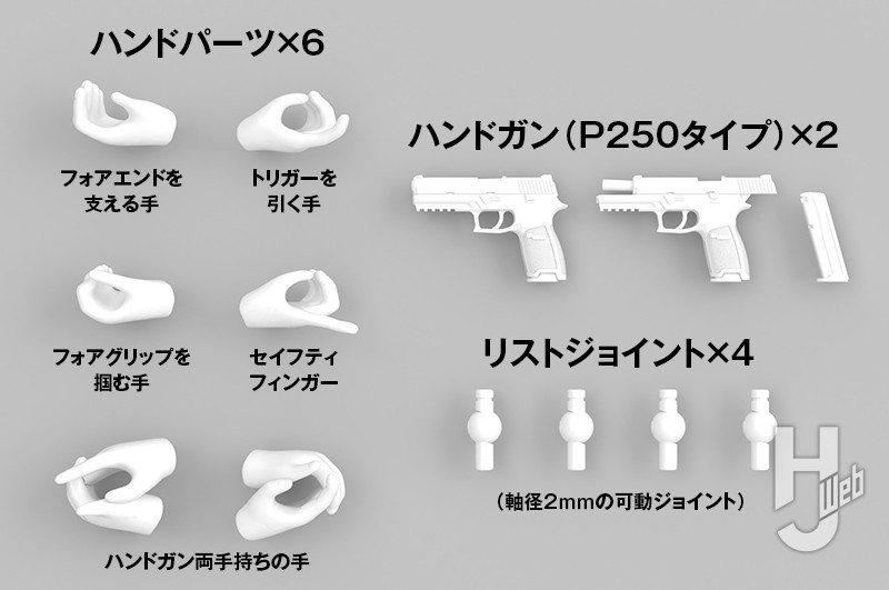 メガミの素体に対応する軸径2mmの可動リストジョイントと、ハンドガン2挺も付属。