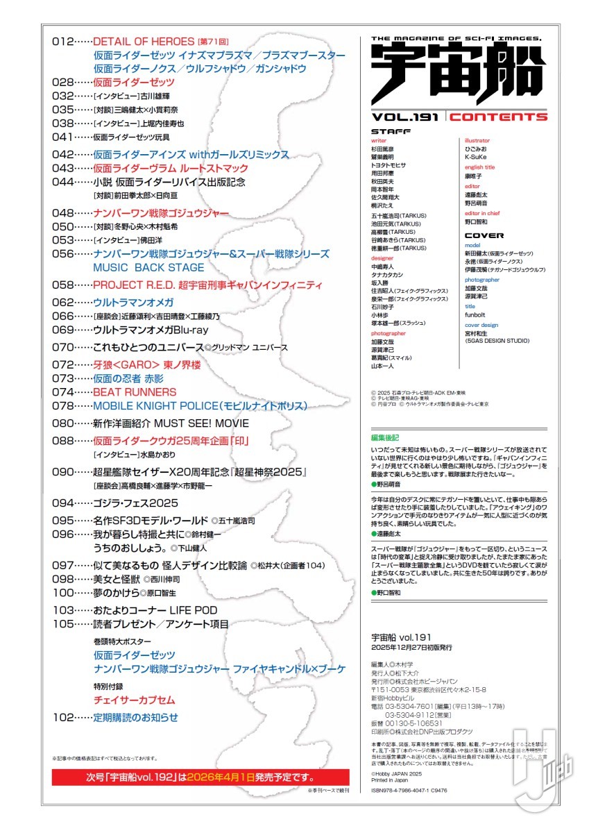 2026年新年号となる今回は、9月から放送がスタートし早くも話題沸騰な『仮面ライダーゼッツ』を大特集! そして、クライマックスに突入する『ナンバーワン戦隊ゴジュウジャー』や『ウルトラマンオメガ』も特集。最新情報から、スタッフ、キャストインタビューなどをたっぷりとお届けいたします! また放送が待ち遠しい『PROJECT R.E.D. 超宇宙刑事ギャバンインフィニティ』の情報も!