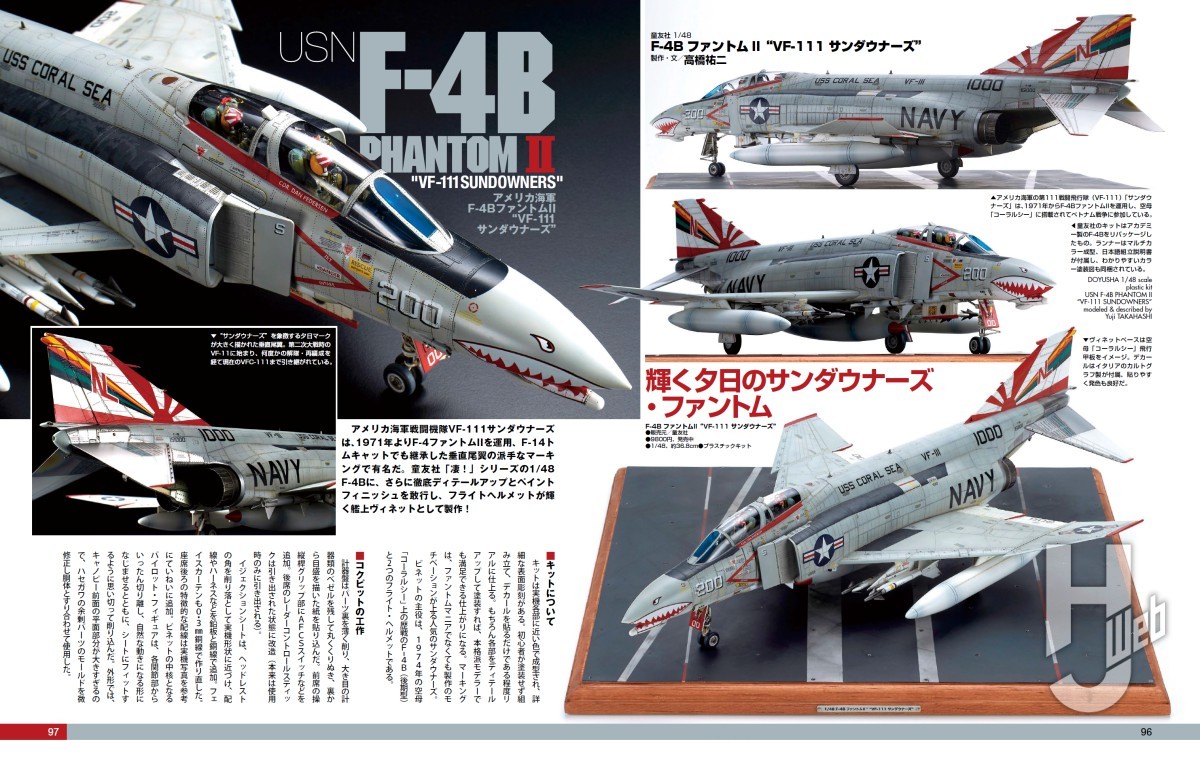 1971年からアメリカ海軍の第111戦闘飛行隊(VF-111)「サンダウナーズ」で運用されていたF-4BファントムIIを高橋祐二氏が童友社のキットで製作。徹底したディテールアップと緻密な塗装により、ミッドウェイ級航空母艦「コーラルシー」上で運用されたF-4Bとして再現されます。