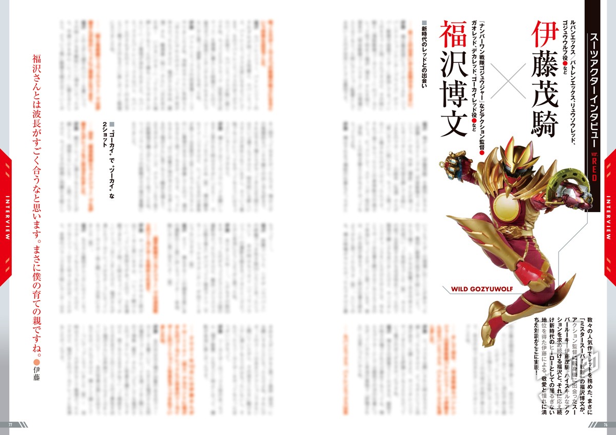 さらに、巻末にはそれぞれの色の戦士を演じたスーツアクター、伊藤茂騎氏、福沢博文氏、竹内康博氏、下園愛弓氏、寺本翔悟氏、五味涼子氏、高田将司氏、のインタビューも掲載されたファン垂涎の1冊です!!